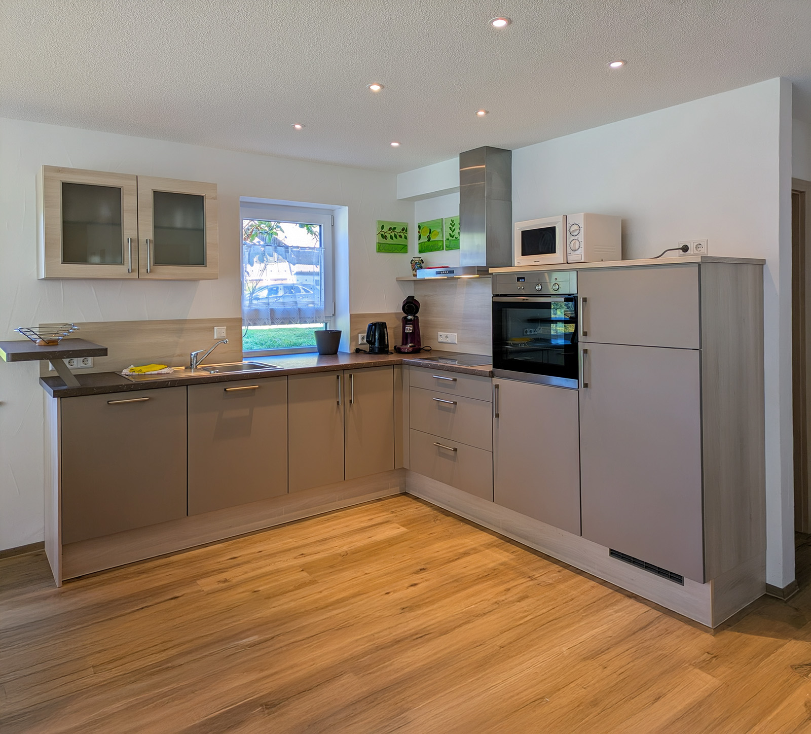 Die offene L-Küche ist modern und voll ausgestattet – mit Cerankochfeld, Backofen, Mikrowelle, Spülmaschine sowie einer praktischen Kühl-Gefrierkombination. Auch Kaffeemaschine und viele weitere nützliche Küchenhelfer stehen bereit, damit Sie sich ganz wie zuhause fühlen und Ihre Lieblingsgerichte entspannt zubereiten können.